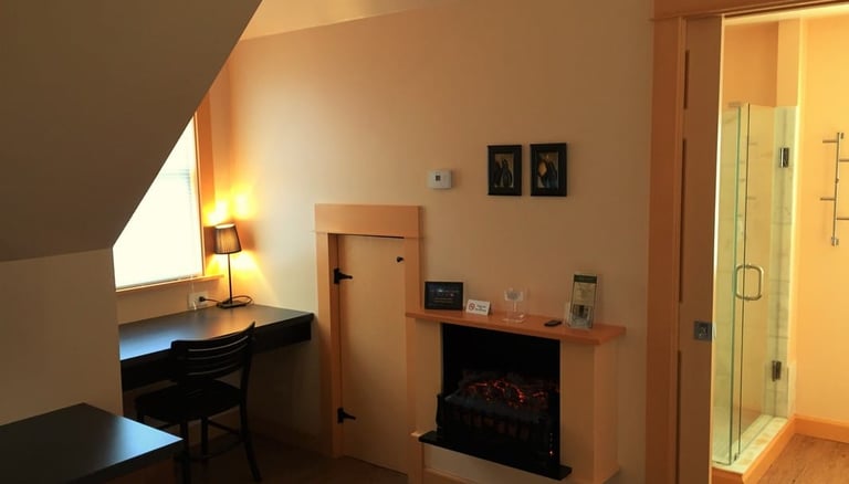 The Loft accommodates three adults. There is a queen size bed and a roll-away twin. The suite features a private entrance, deck and bath, electric fireplace, central air, ROKU TV and WIFI. The mini-kitchen is equipped with a fridge, drip coffee maker, toaster, microwave and filtered drinking water. It is located on the second floor of the building immediately adjacent to the Jailhouse.
